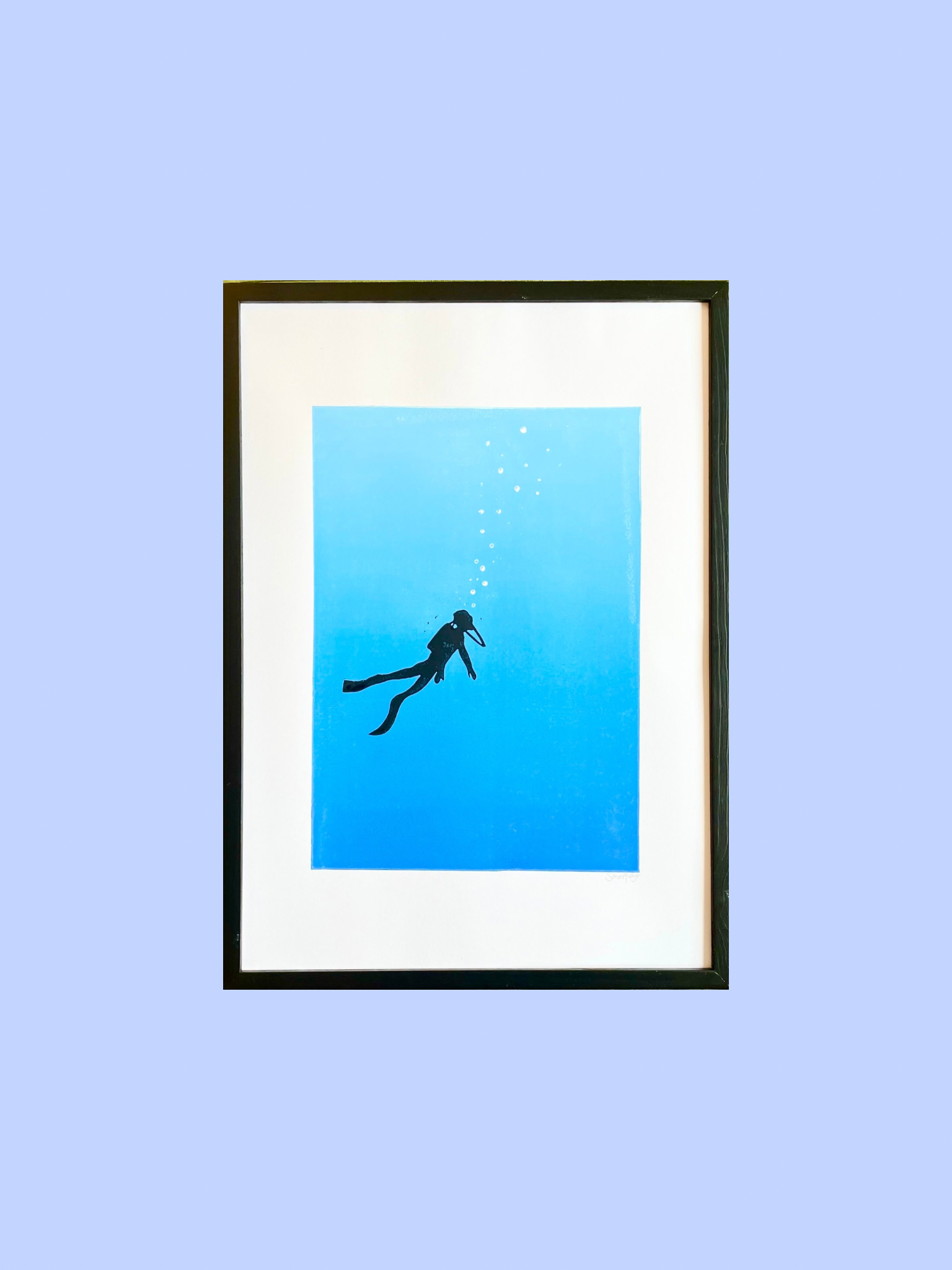 Et linoleumstryk af en dykker under vandet. Et motiv, der indfanger roen og stilheden under havets overflade - hvor alt føles let, og verden bliver stille et øjeblik.
