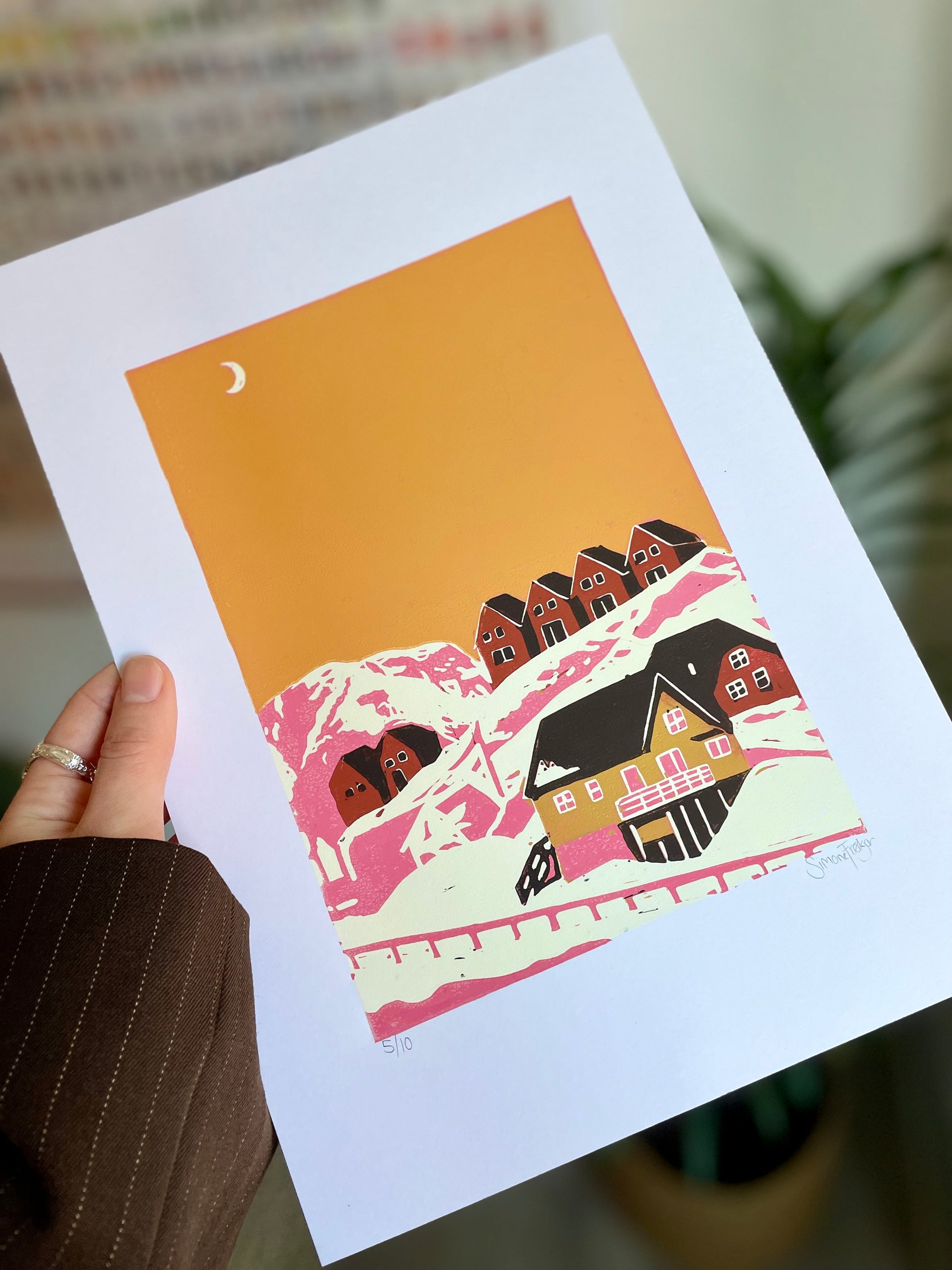 Trykket er lavet som reduktionstryk med 6 lag farve. Motivet skæres i én plade, og mellem hvert farvelag skærer jeg mere af pladen væk. Pladen ødelægges derfor undervejs, og motivet kan ikke trykkes igen. Hvert tryk er derfor one of a kind.