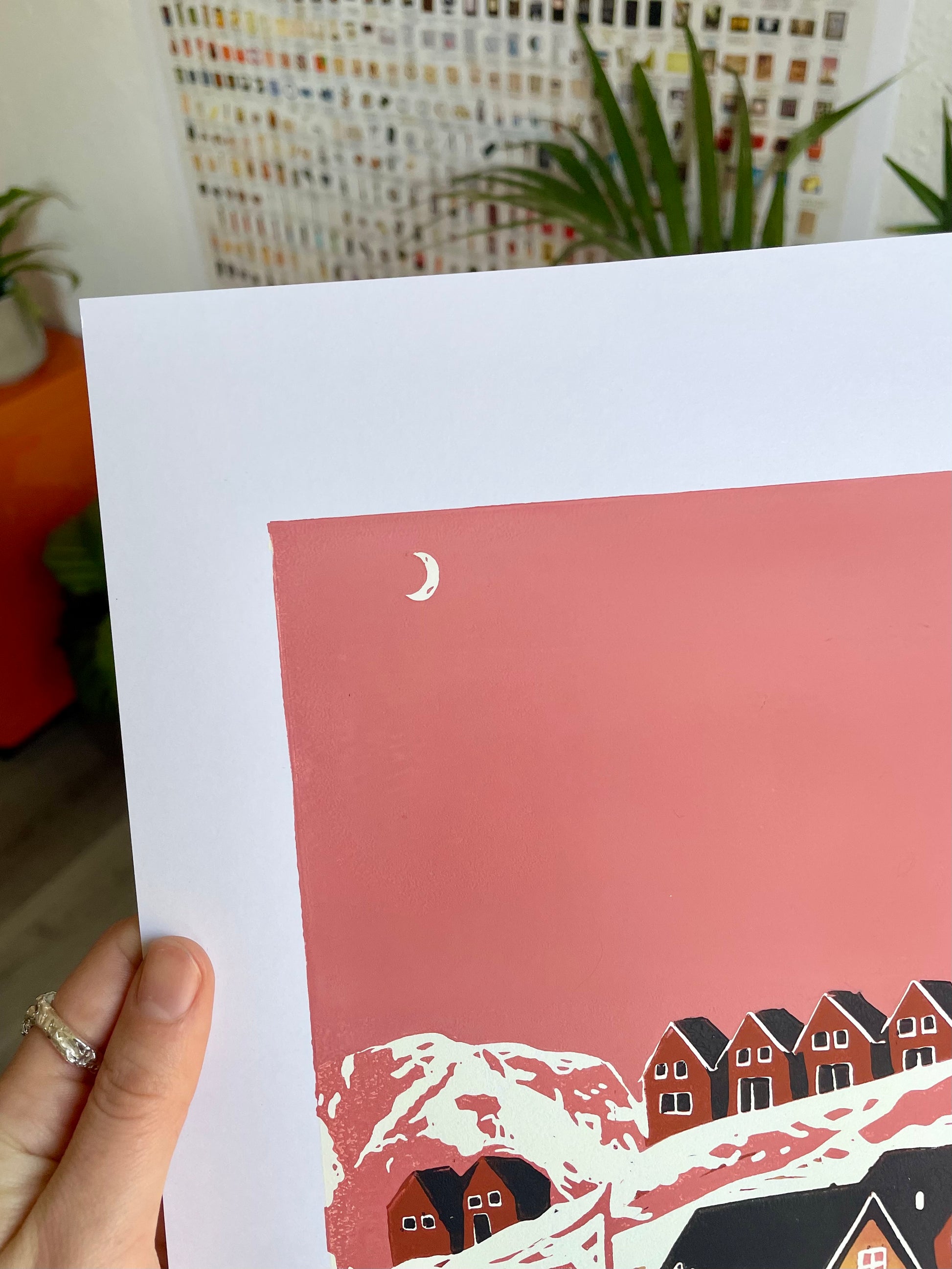 Trykket er lavet som reduktionstryk med 6 lag farve. Motivet skæres i én plade, og mellem hvert farvelag skærer jeg mere af pladen væk. Pladen ødelægges derfor undervejs, og motivet kan ikke trykkes igen. Hvert tryk er derfor one of a kind.