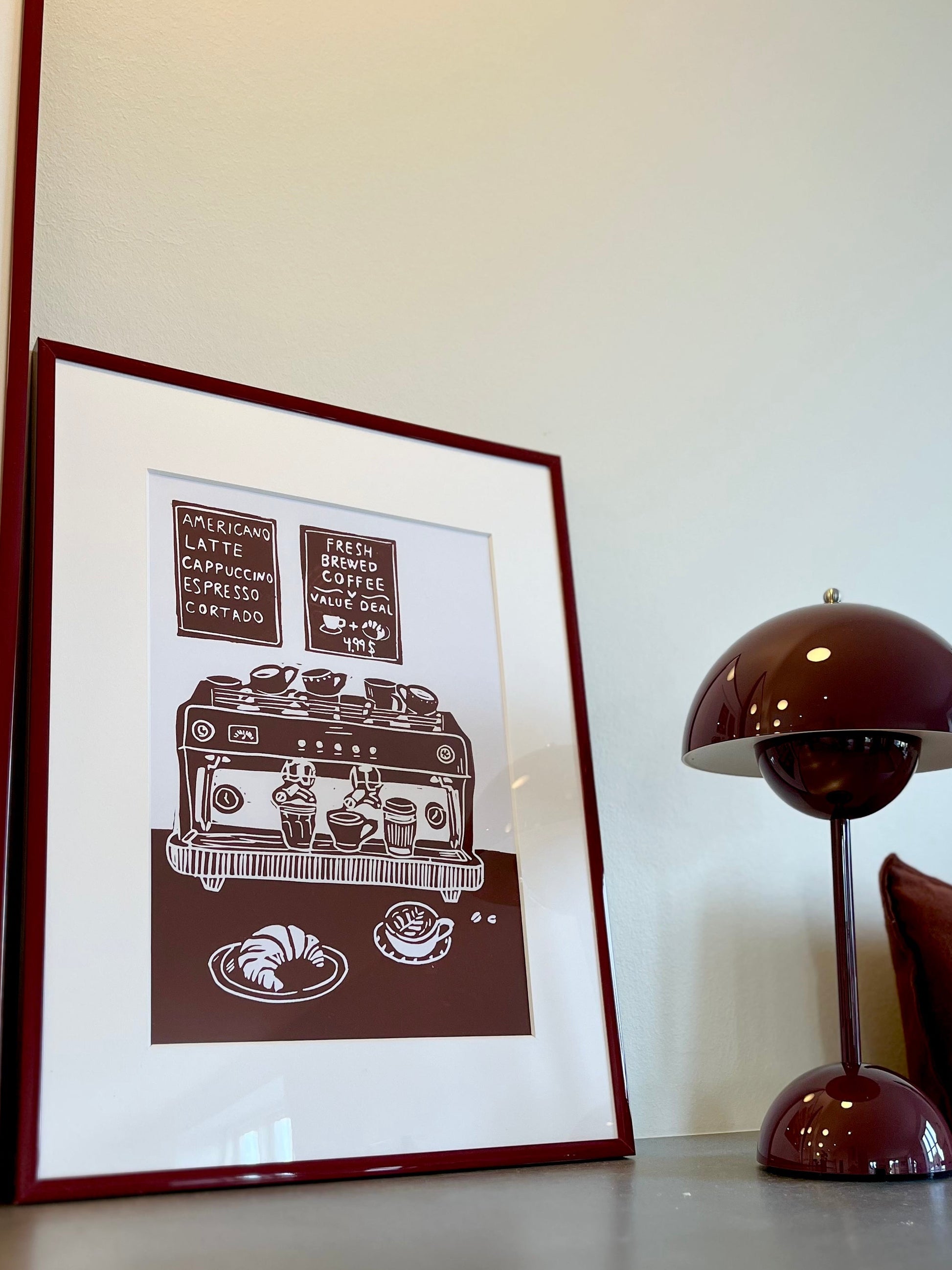 Dette linoleumstryk indfanger hyggen og pulsen bag cafédisken. Med et bord, en espressomaskine og prisskilte i baggrunden inviterer trykket dig ind i baristaens verden – et sted, hvor kaffe bliver til mere end bare en drik. Perfekt til kaffeelskere og dem, der sætter pris på hverdagslivets små detaljer.