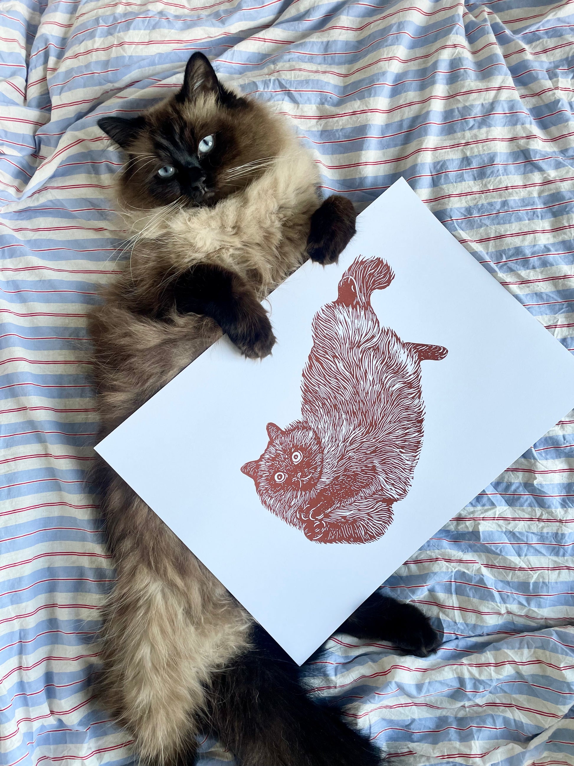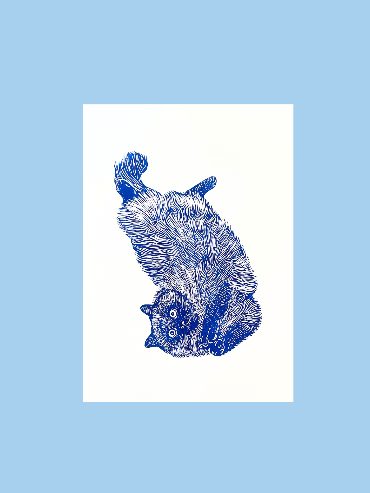“Manse" er et linoleumstryk inspireret af min egen ragdoll, Manse, der ligger på ryggen på den helt klassiske ragdoll-måde – afslappet, blød og uimodståeligt charmerende. Et perfekt tryk til katteelskeren.
