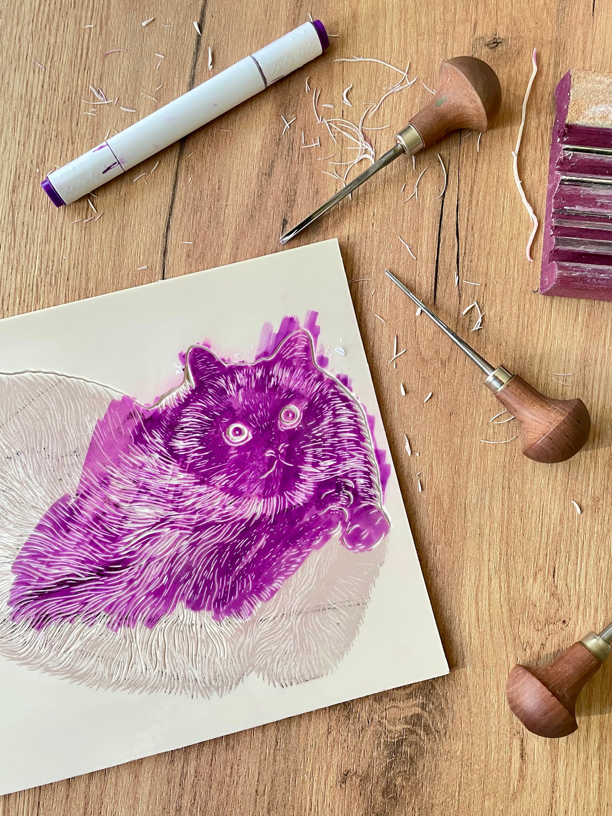 Da jeg trykker hver enkelt i hånden, kan farvens intensitet variere, hvilket gør hvert tryk helt unikt.