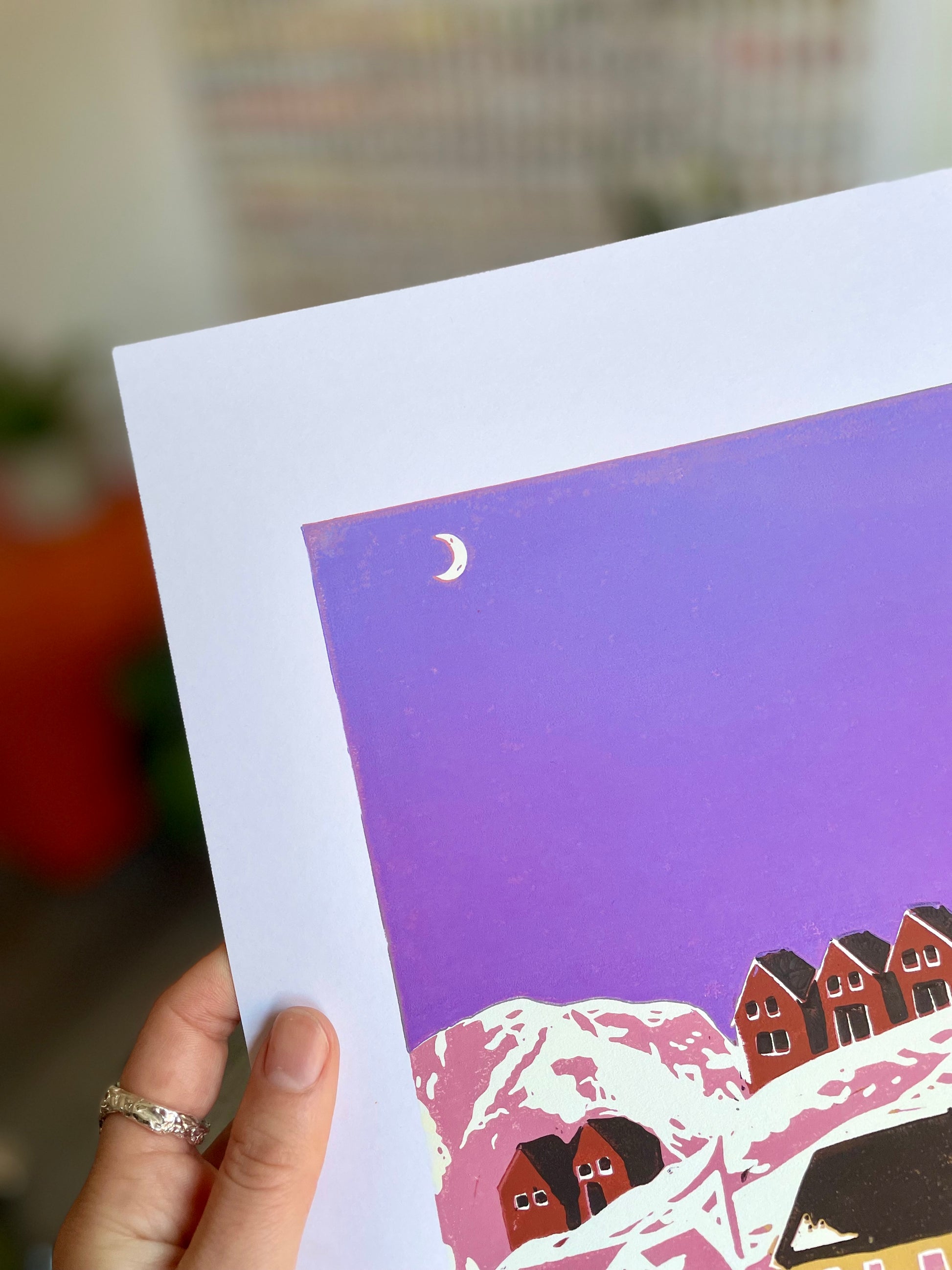 Trykket er lavet som reduktionstryk med 6 lag farve. Motivet skæres i én plade, og mellem hvert farvelag skærer jeg mere af pladen væk. Pladen ødelægges derfor undervejs, og motivet kan ikke trykkes igen. Hvert tryk er derfor one of a kind.